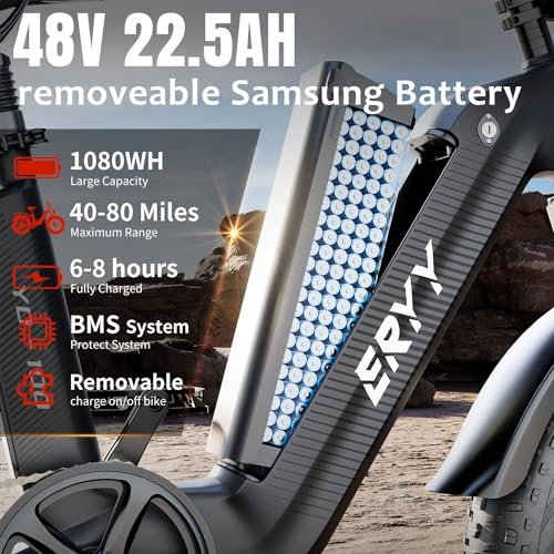• 【48V 22.5AH Li-ion Batery】 1080WH Removable Large Battery provides a long range of 40 miles, which offers three driving modes, pure electric, pedal-assist and manual. The rider weights 133lbs and ride it on a flat rode at the speed of 12mph. The bike can reach a range of 70-80 miles in PAS 1 Mode; the bike can reach a range of 50-62 miles in Throttle 1-Speed Mode.