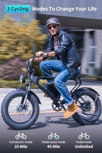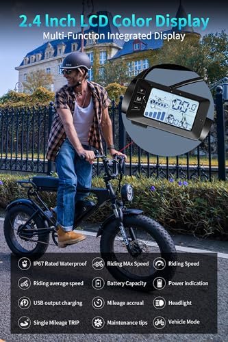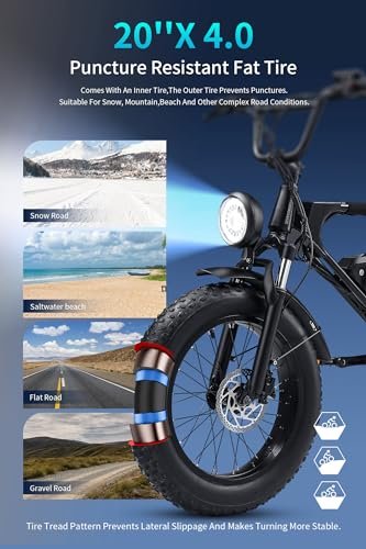 ????【Versatile Terrain Adaptability Safety First】- Fat tire electric bike with its 20″x4.0 Fat Tire,this Ebike mountain bike is adaptable to various terrains,such as snow,muddy,gravel,beach,mountain or flat road.The cruiser bike comes with an 12V LED integrated headlight, a LED rear light that illuminates the way forward,making it safe and visible for night riding. You can ride it in any season or weather condition with ease and confidence.