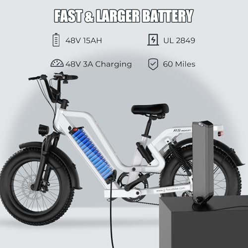 • 【FAST CHARGING & LARGE BATTERY】RS electric bike features a 48V 15/25AH large capacity battery & 3.0A fast charing, offering a maximum range of 60-100 miles. Additional anti-theft measures also enhance security like the battery key lock and independent battery switch. Moreover, the RS is UL 2849 certified for safety;